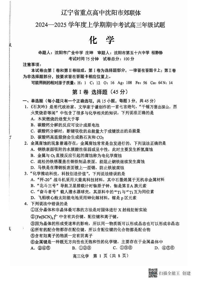 辽宁省沈阳市郊联体2025届上学期11月期中考试 化学