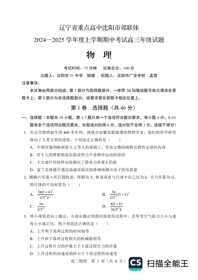 辽宁省沈阳市郊联体2025届上学期11月期中考试 物理