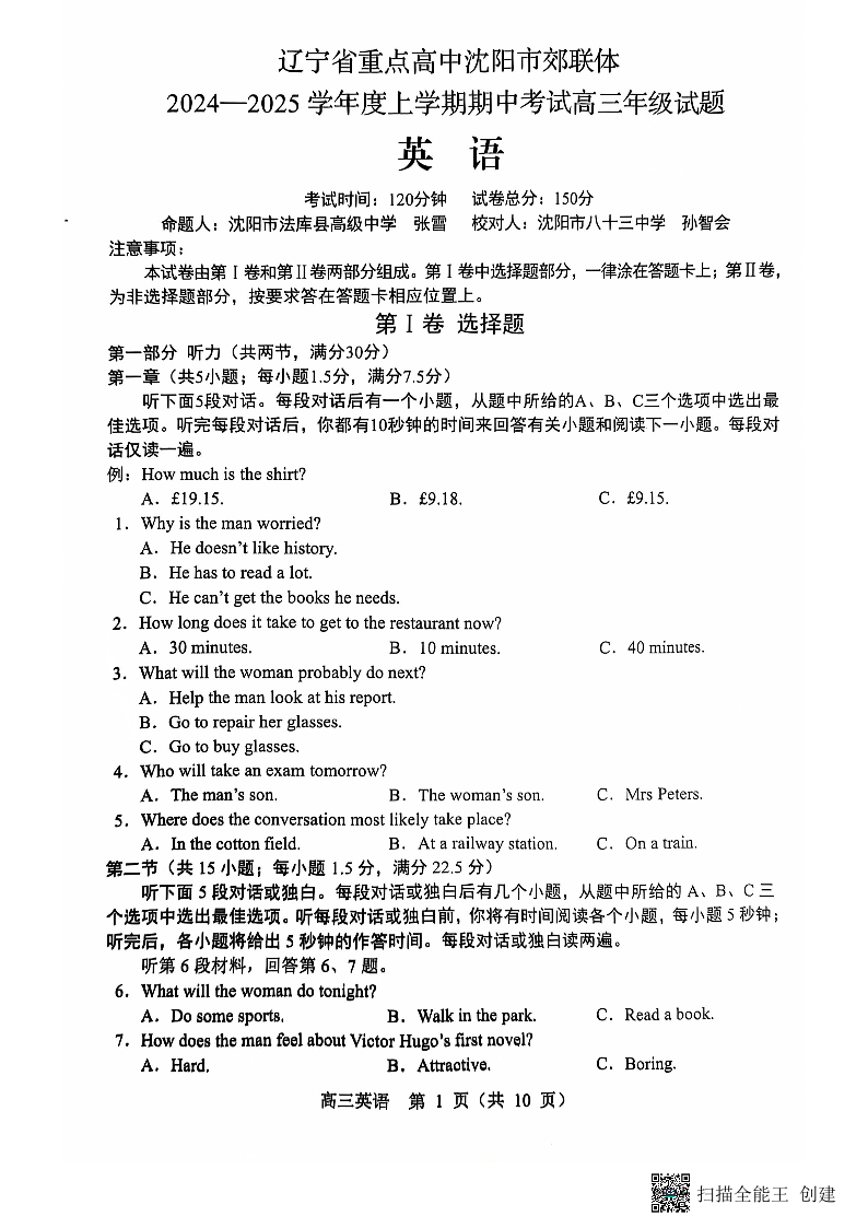 辽宁省沈阳市郊联体2025届上学期11月期中考试 英语