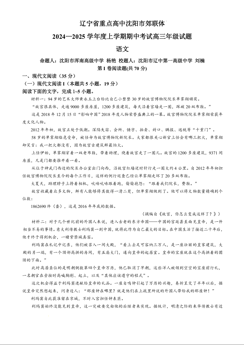 辽宁省沈阳市郊联体2025届上学期11月期中考试 语文