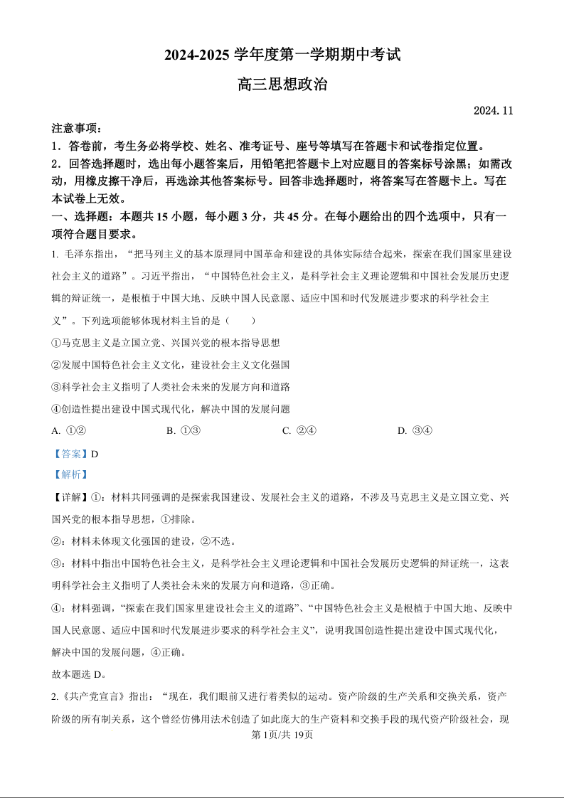 山东省青岛市黄岛区2025届学期高三11月期中考试 政治答案