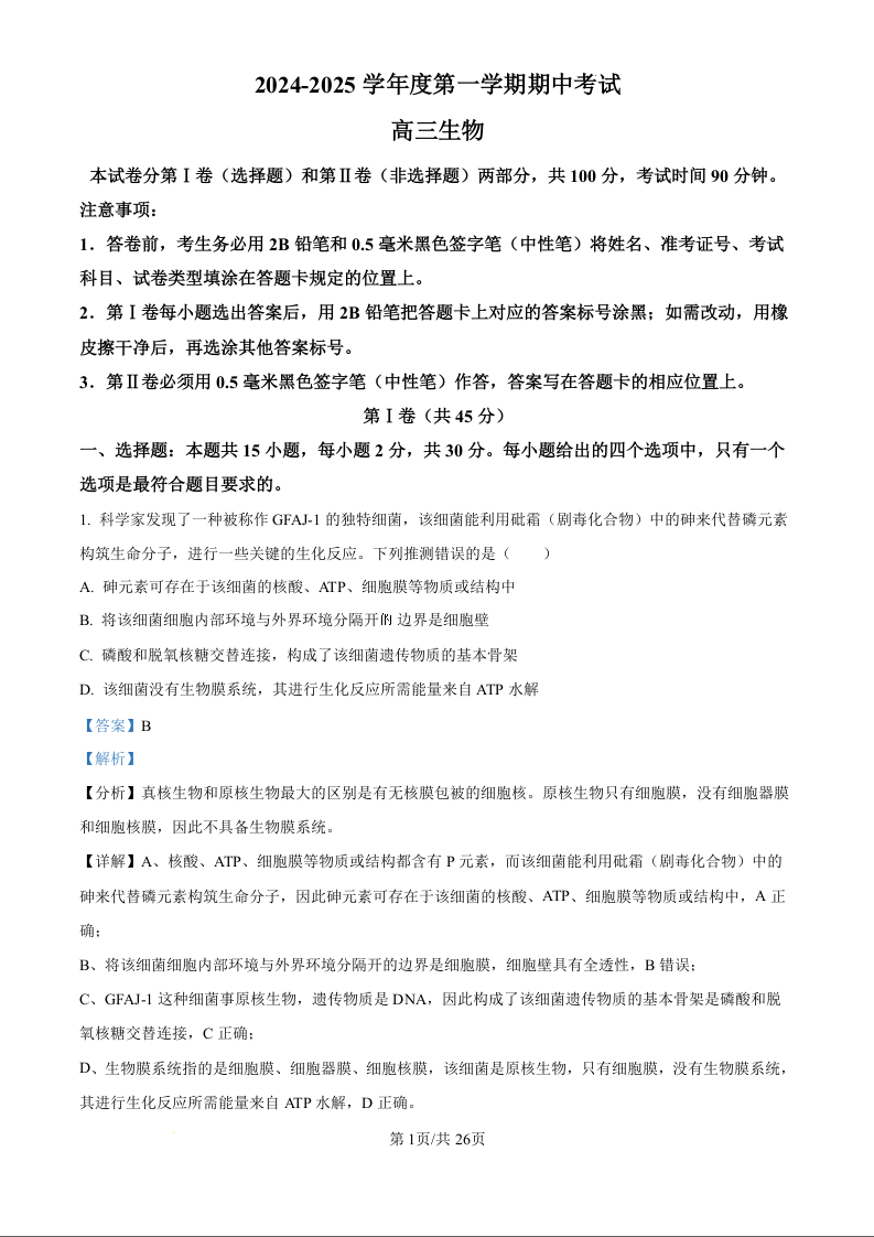 山东省青岛市黄岛区2025届学期高三11月期中考试 生物答案