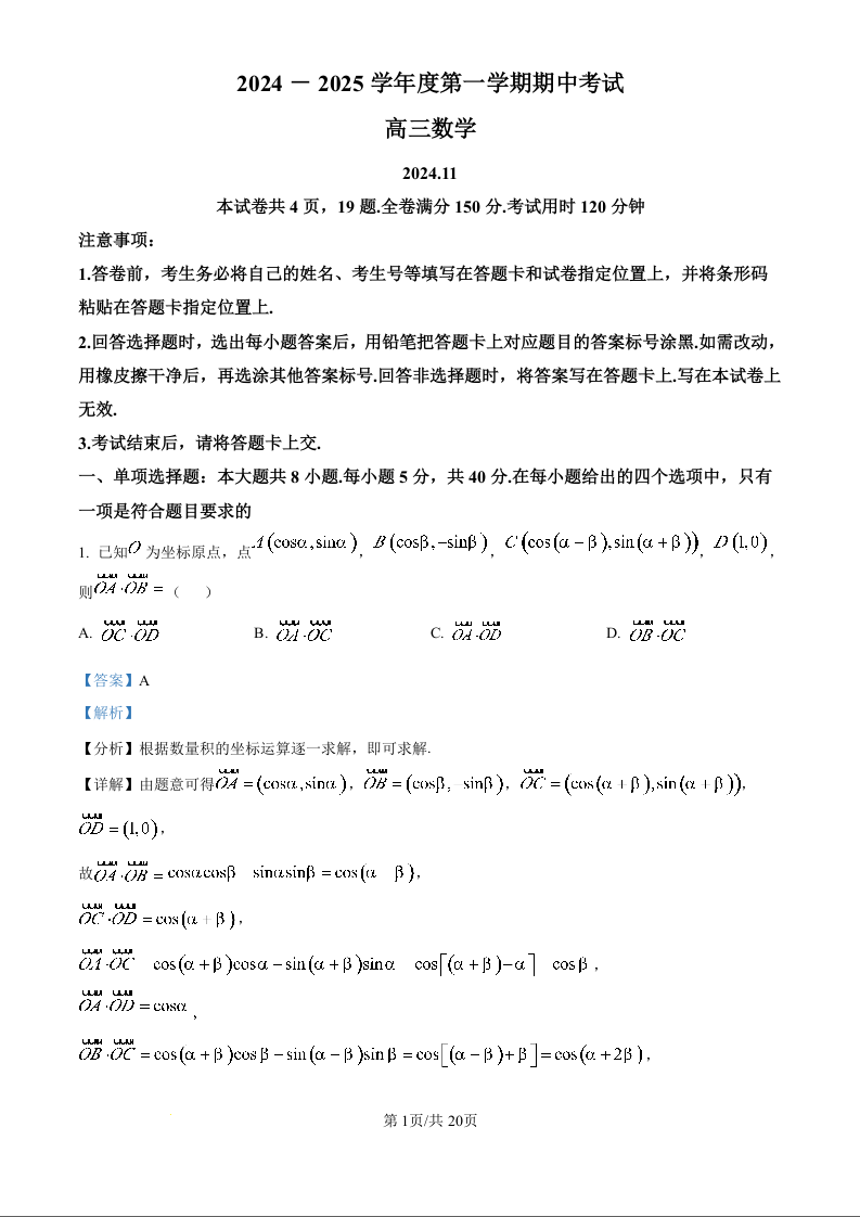 山东省青岛市黄岛区2025届学期高三11月期中考试 数学答案