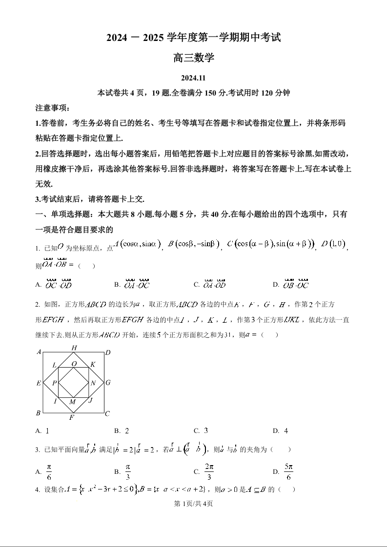 山东省青岛市黄岛区2025届学期高三11月期中考试 数学