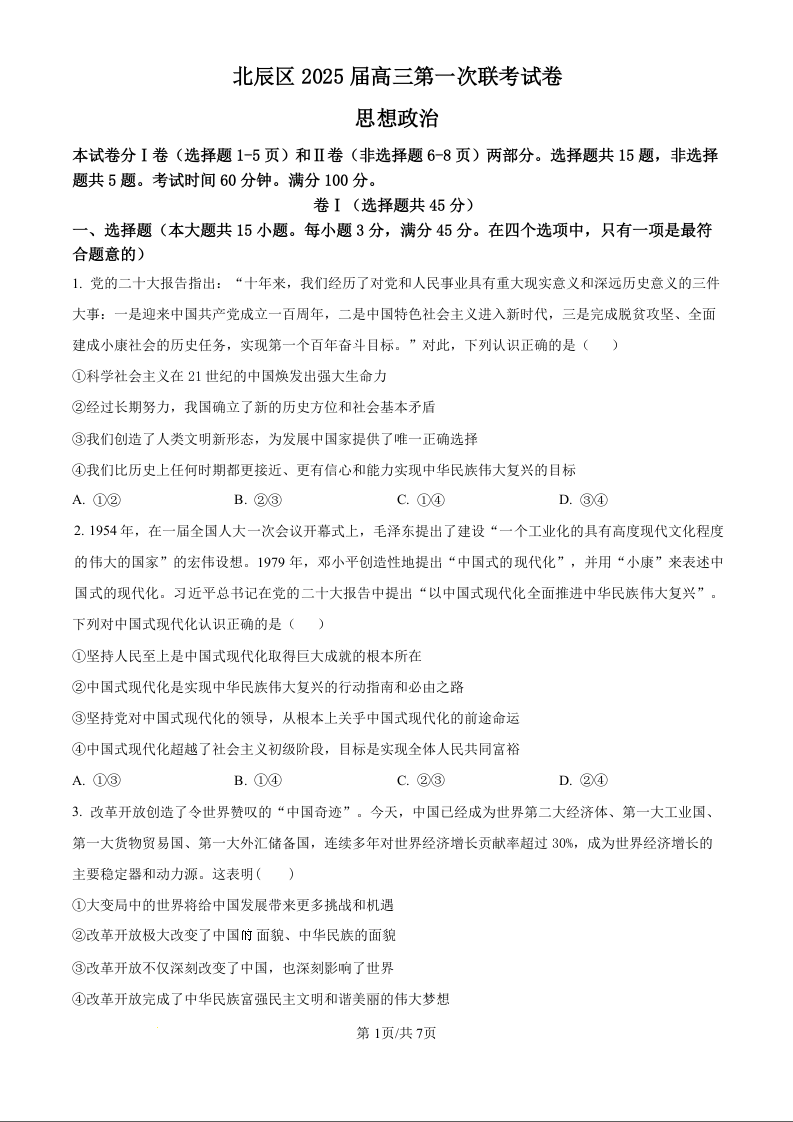 天津市北辰区2025届高三上学期11月期中考试 政治