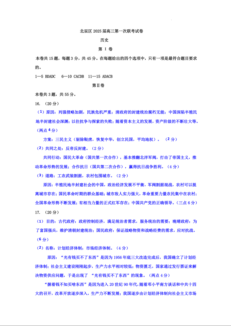 天津市北辰区2025届高三上学期11月期中考试 历史答案