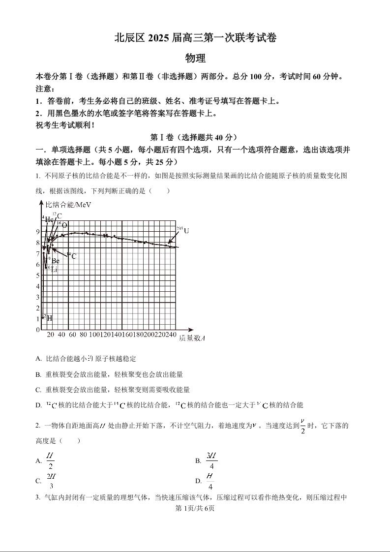 天津市北辰区2025届高三上学期11月期中考试 物理