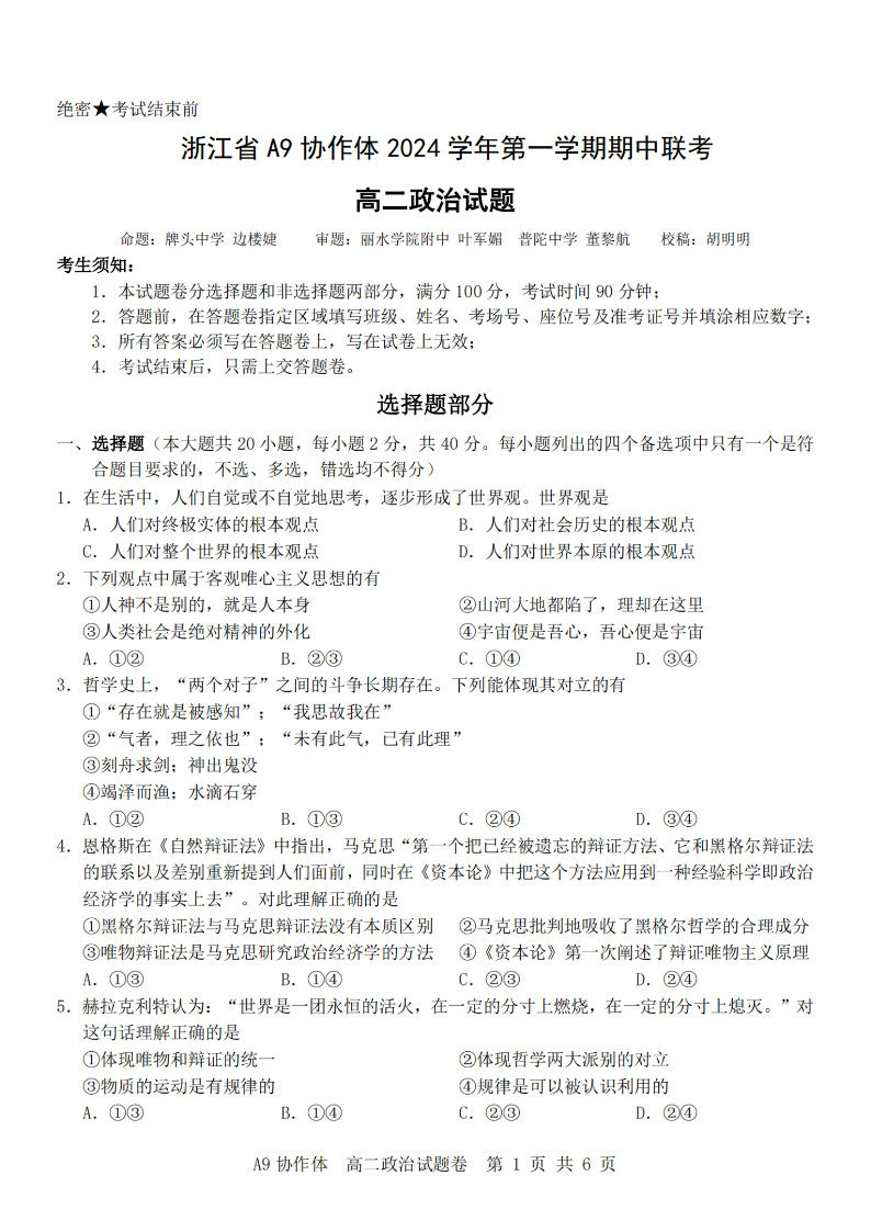 浙江省A9协作体2024学年高二第一学期期中联考 政治