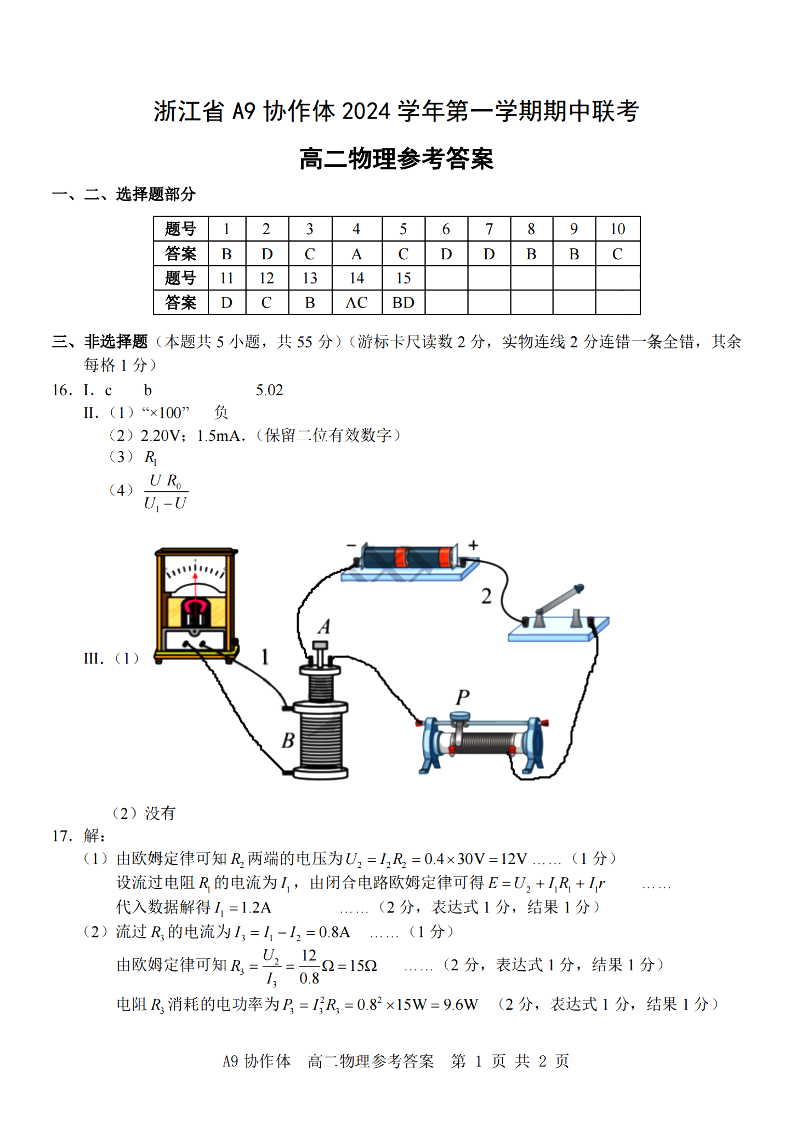 浙江省A9协作体2024学年高二第一学期期中联考 物理答案