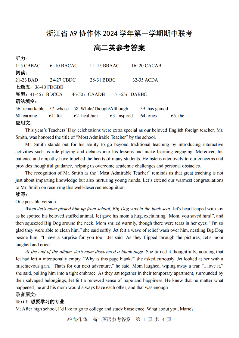 浙江省A9协作体2024学年高二第一学期期中联考 英语答案