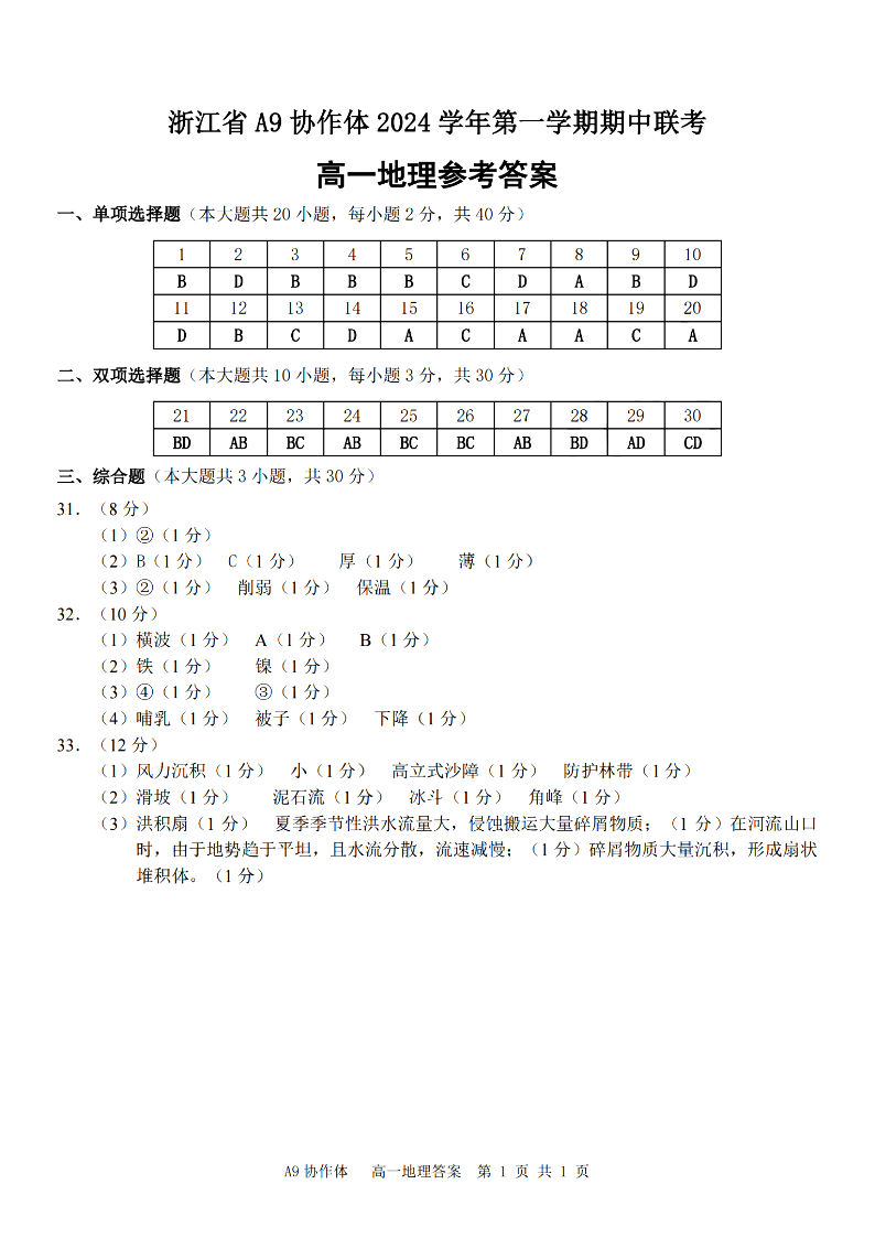 浙江省A9协作体2024学年高一第一学期期中联考 地理答案
