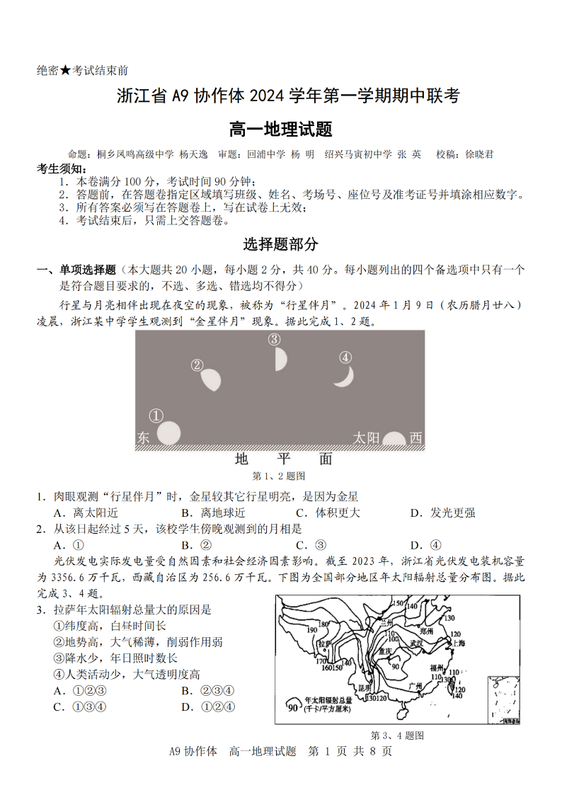 浙江省A9协作体2024学年高一第一学期期中联考 地理