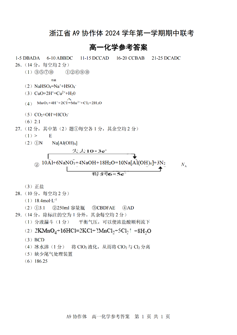 浙江省A9协作体2024学年高一第一学期期中联考 化学答案