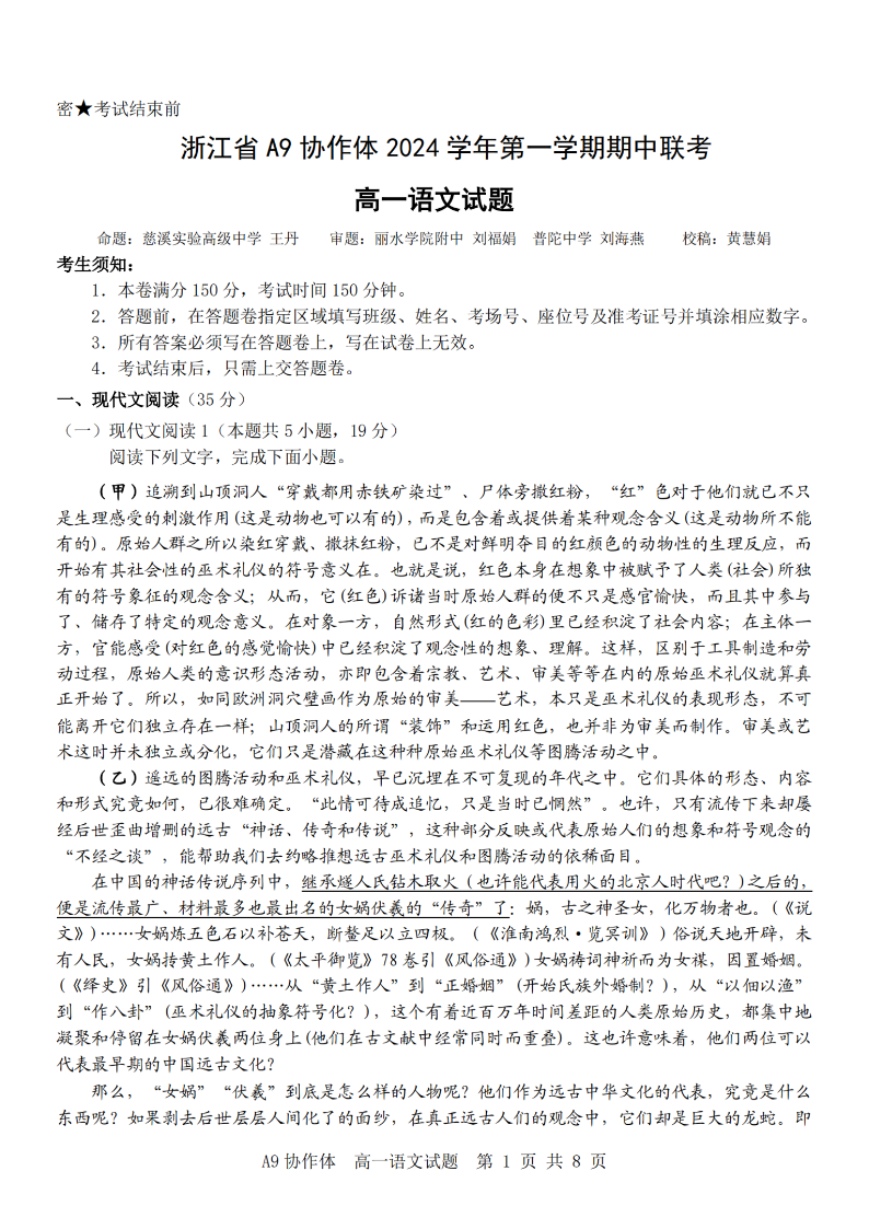 浙江省A9协作体2024学年高一第一学期期中联考 语文