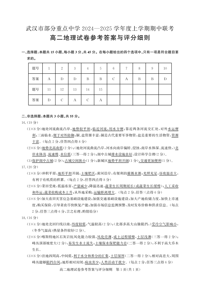武汉市部分重点中学2024-2025学年高二年级期中联考 地理答案