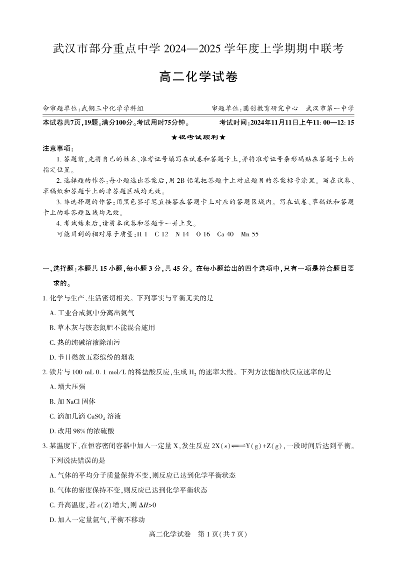 武汉市部分重点中学2024-2025学年高二年级期中联考 化学