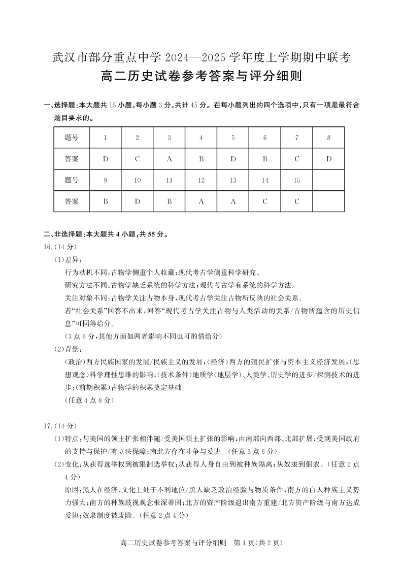 武汉市部分重点中学2024-2025学年高二年级期中联考 历史答案