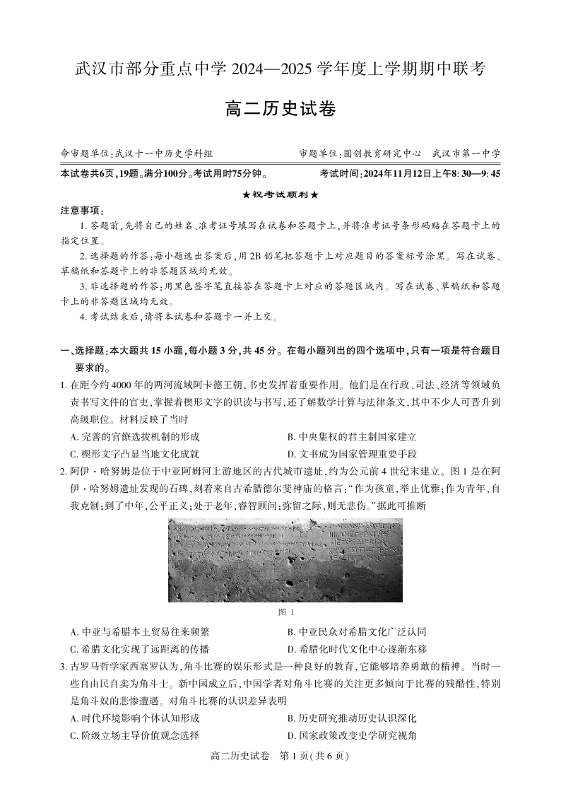 武汉市部分重点中学2024-2025学年高二年级期中联考 历史