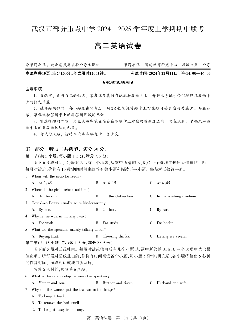 武汉市部分重点中学2024-2025学年高二年级期中联考 英语