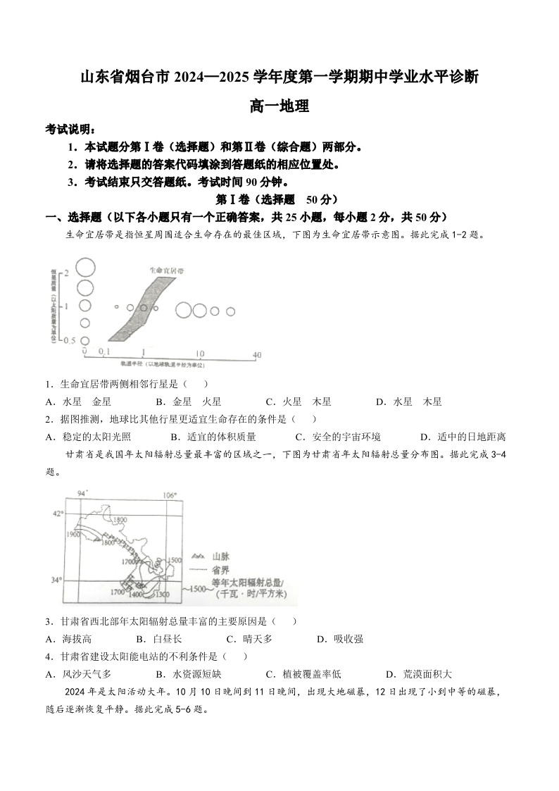 山东省烟台市2024-2025学年高一上学期11月期中考试 地理