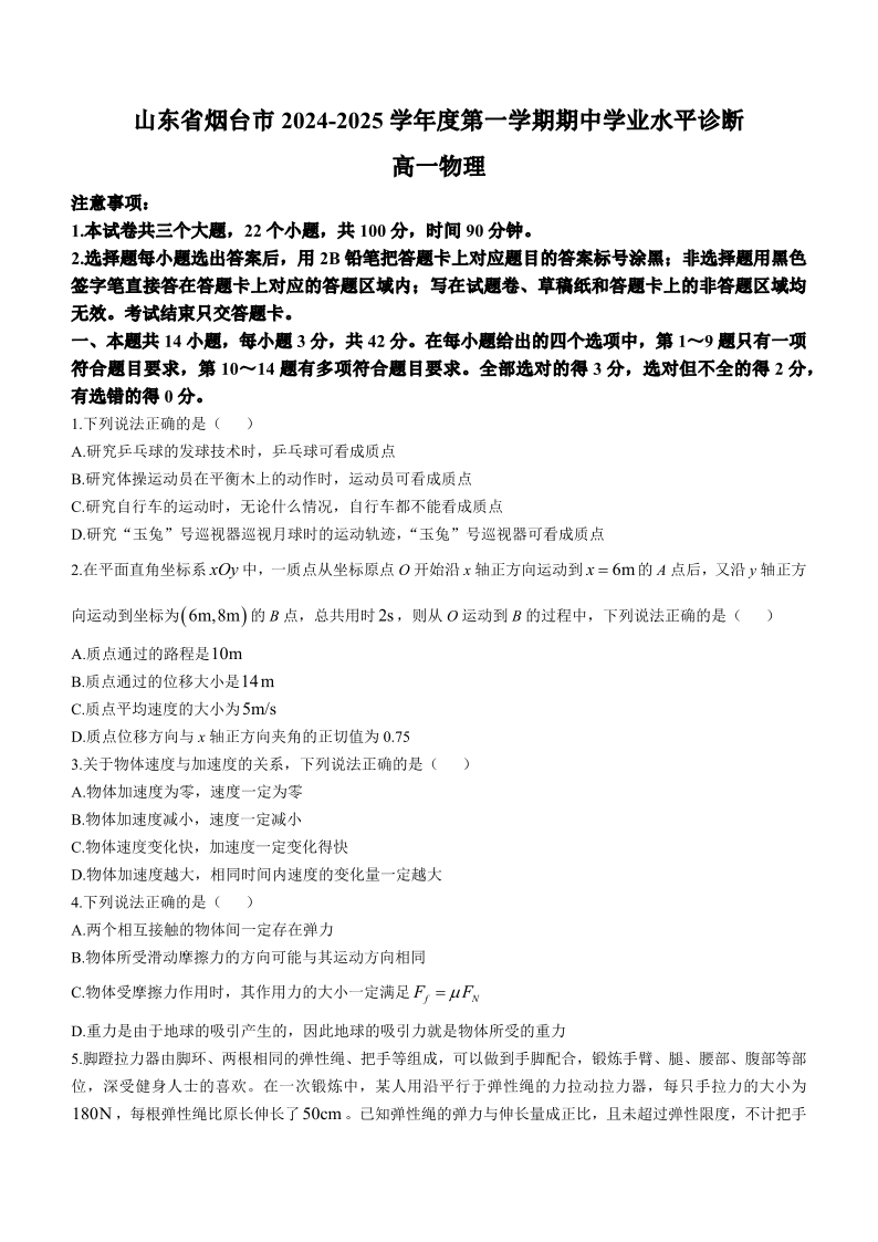 山东省烟台市2024-2025学年高一上学期11月期中考试 物理