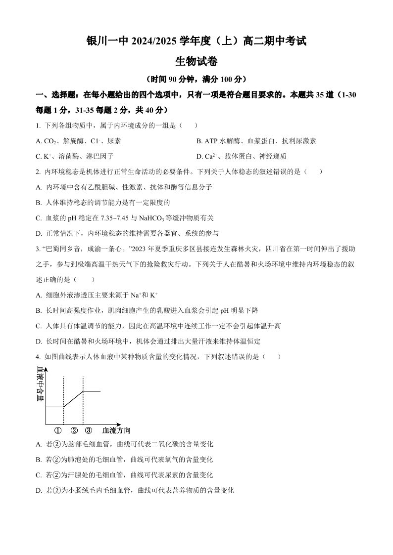 宁夏回族自治区银川一中2024-2025学年高二上学期期中考试 生物