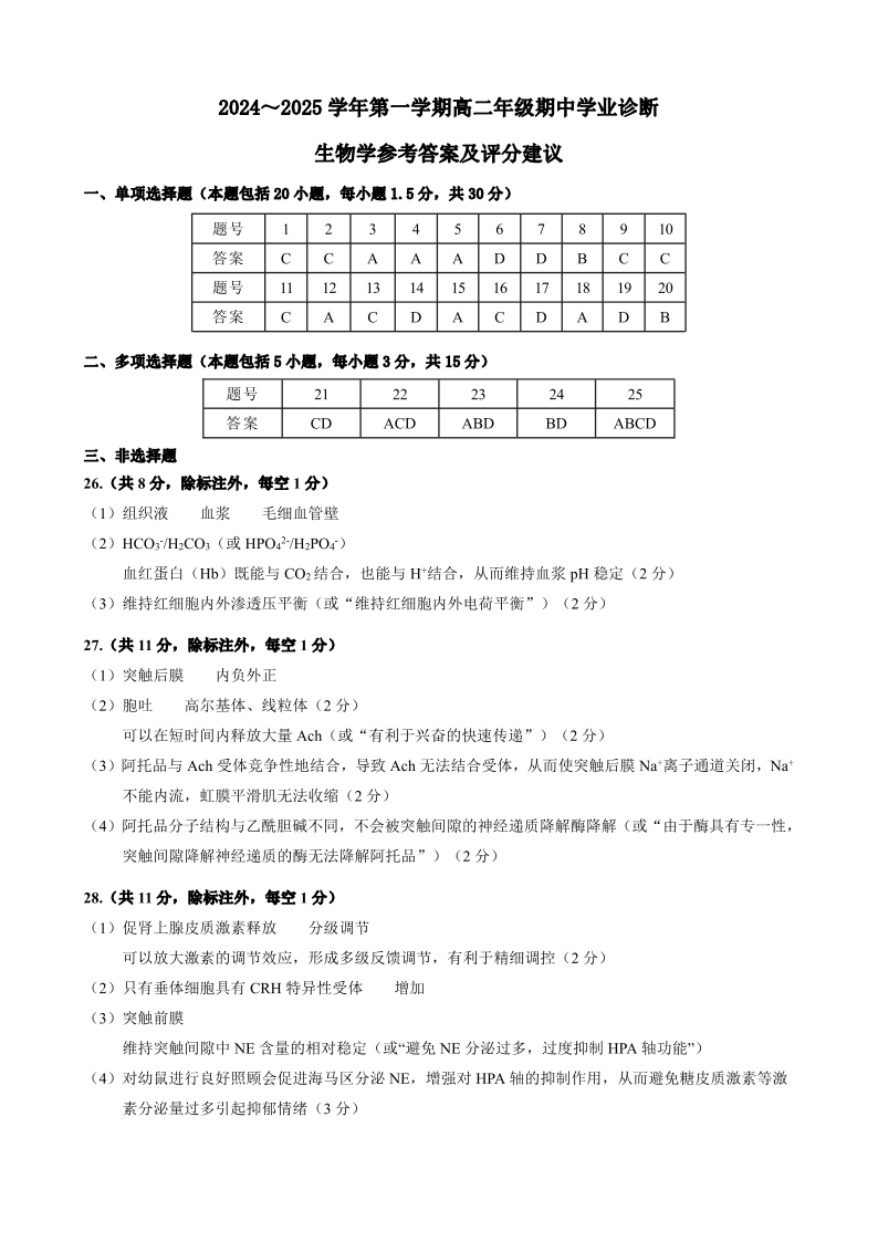 山西省太原市2024-2025学年高二上学期11月期中考试 生物答案