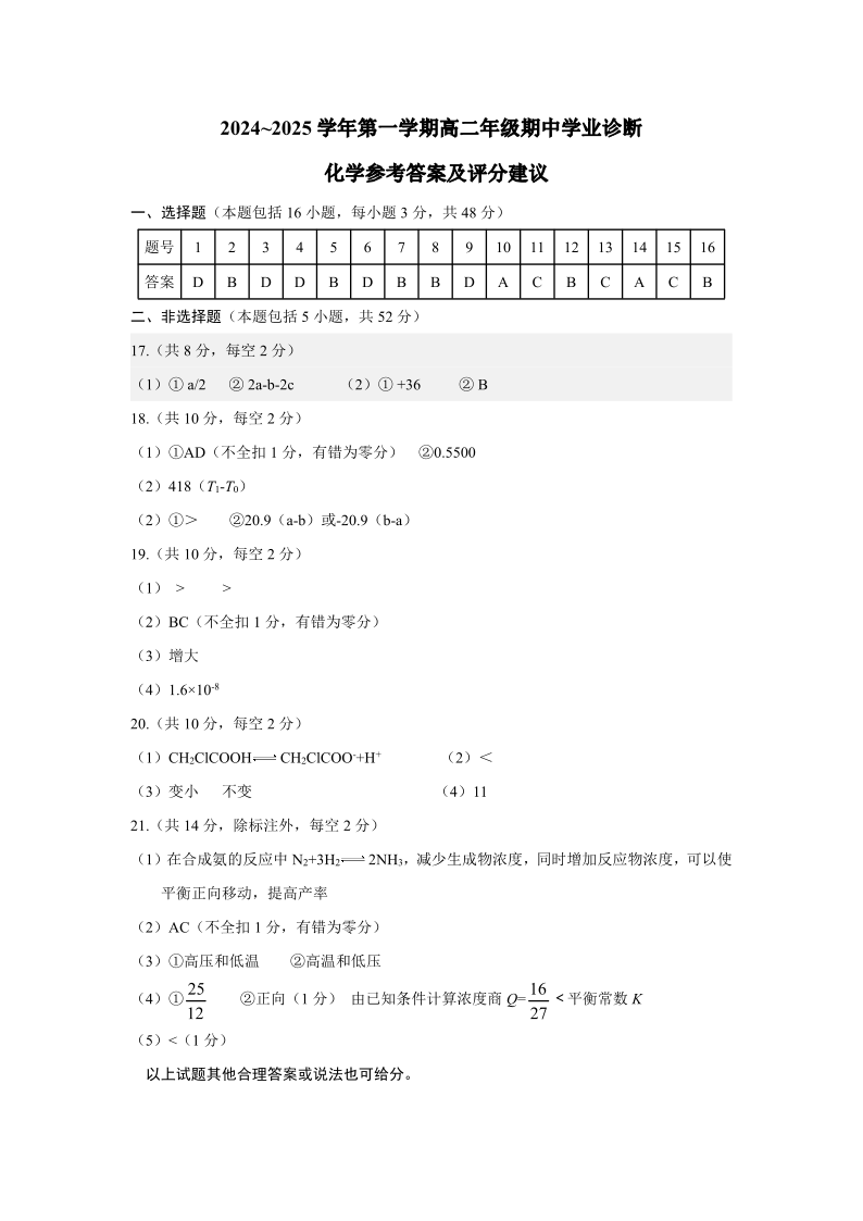 山西省太原市2024-2025学年高二上学期11月期中考试 化学答案