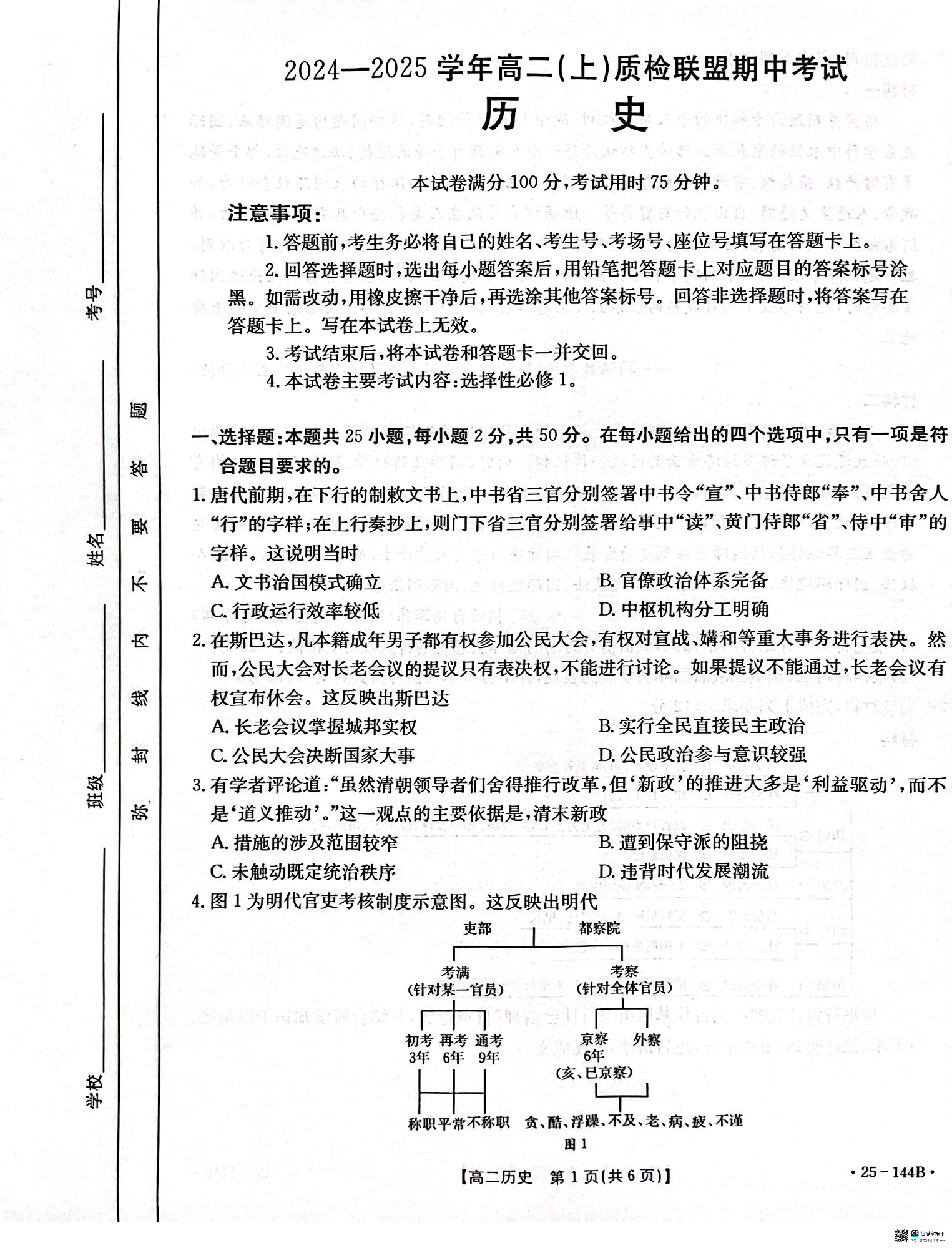 河北省邢台市质检联盟2024-2025学年高二上学期期中考试 历史