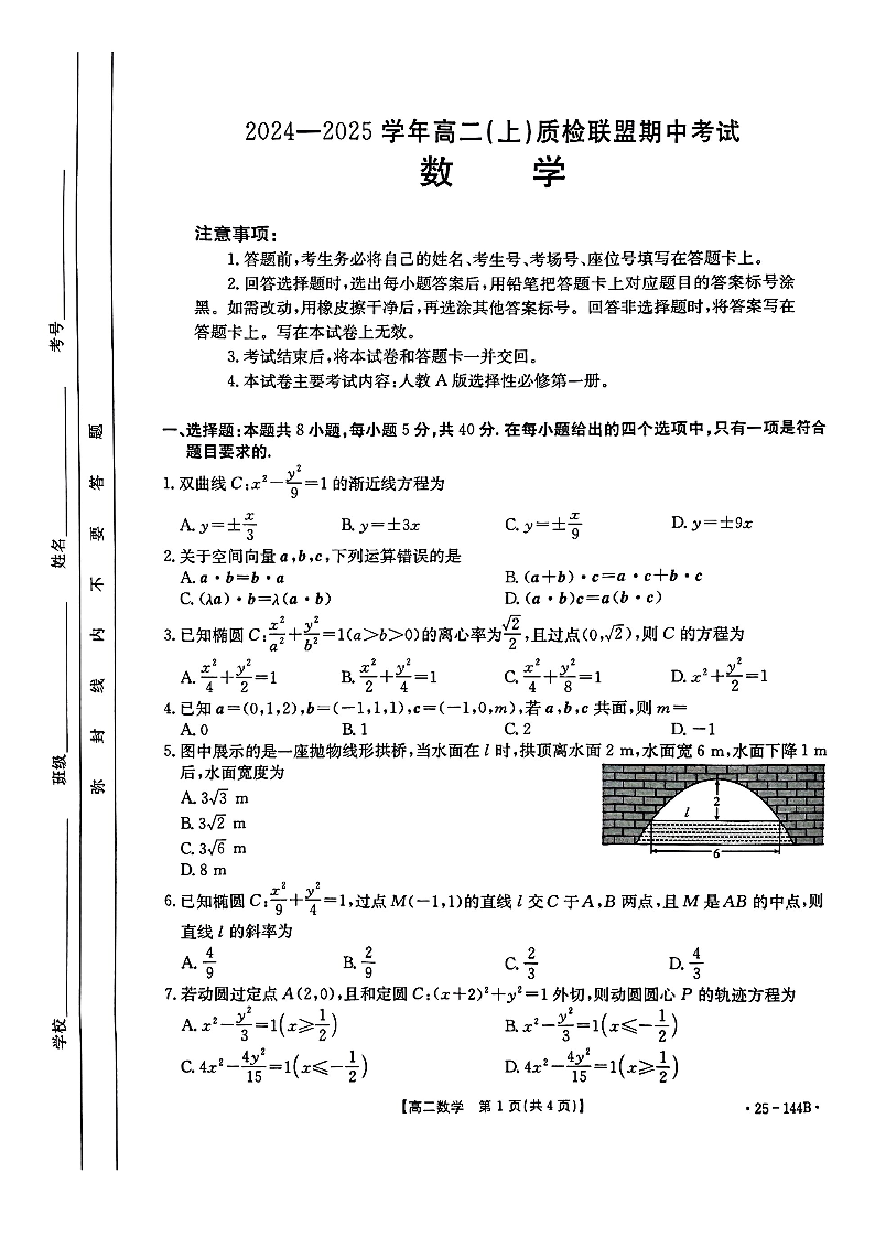 河北省邢台市质检联盟2024-2025学年高二上学期期中考试 数学