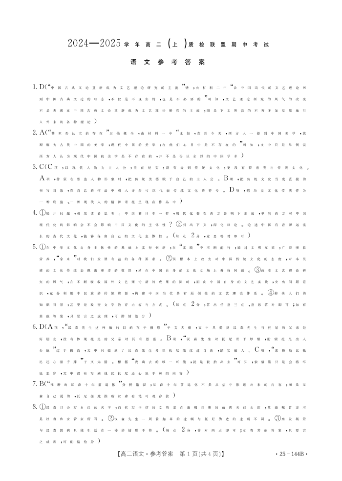 河北省邢台市质检联盟2024-2025学年高二上学期期中考试 语文参考答案