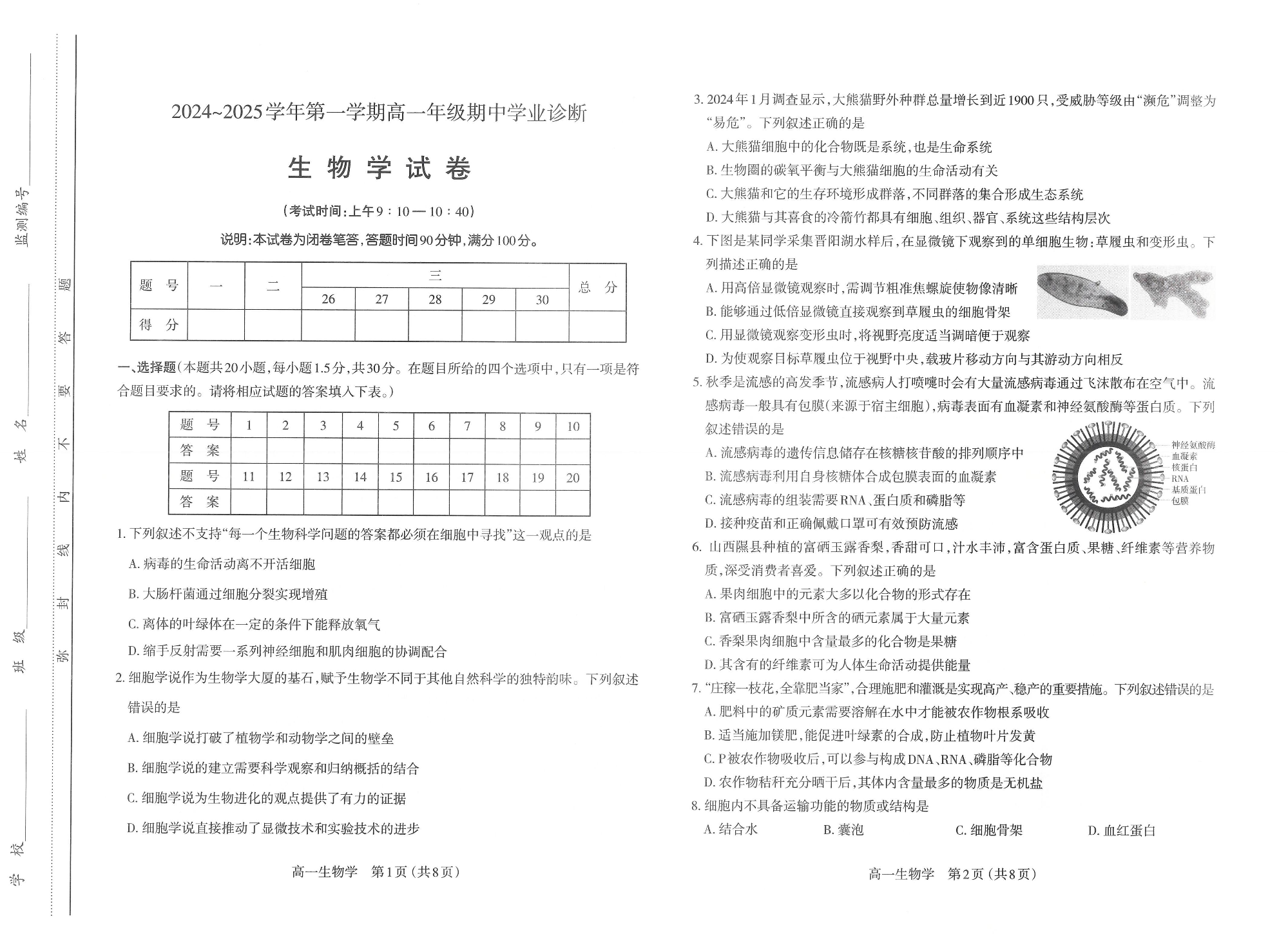 山西省太原市2024-2025学年高一上学期11月期中考试 生物