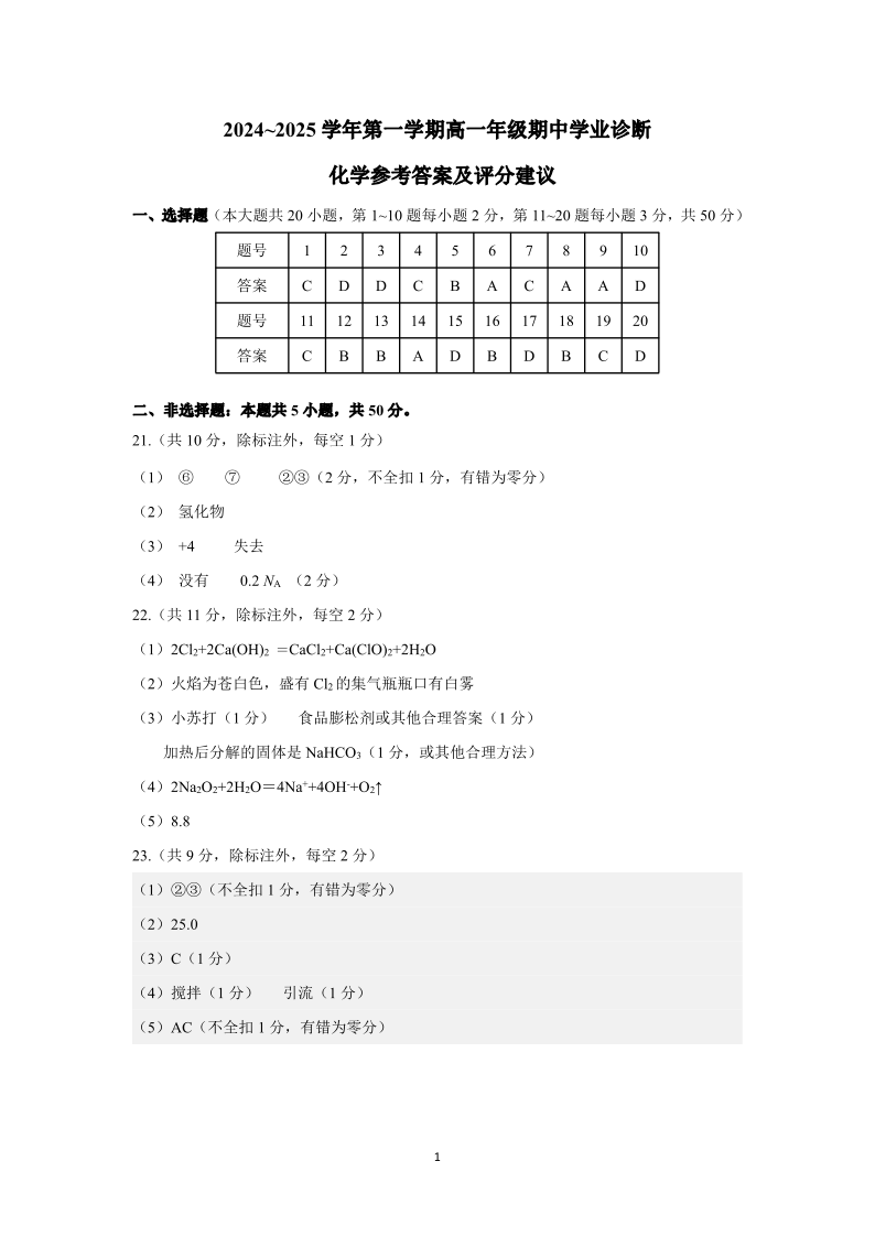 山西省太原市2024-2025学年高一上学期11月期中考试 化学答案