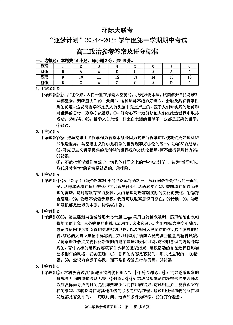 河南省驻马店市环际大联考2024-2025学年高二上学期期中考试 政治答案