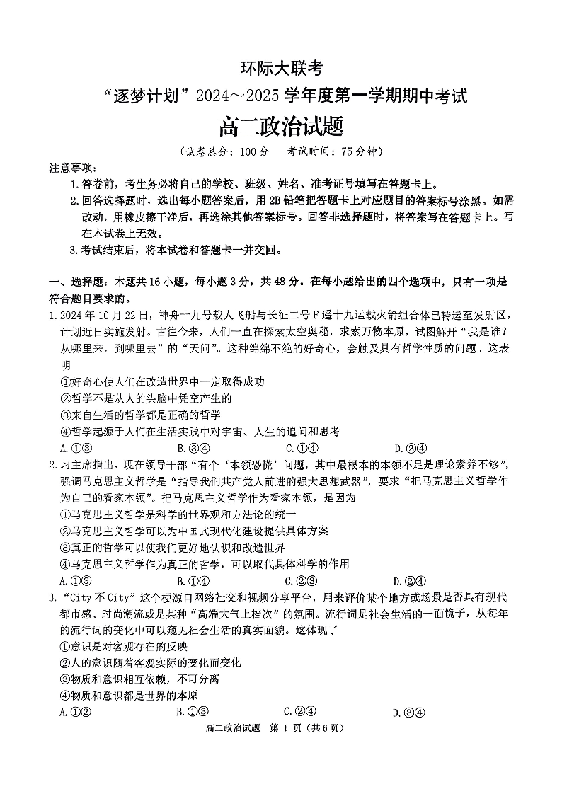 河南省驻马店市环际大联考2024-2025学年高二上学期期中考试 政治