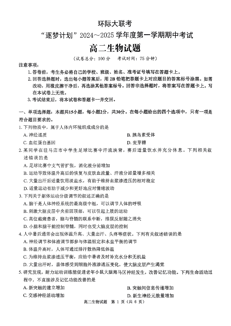 河南省驻马店市环际大联考2024-2025学年高二上学期期中考试 生物
