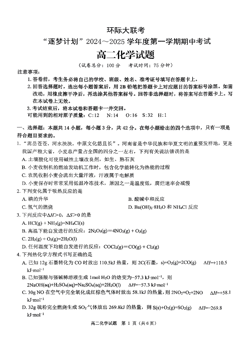 河南省驻马店市环际大联考2024-2025学年高二上学期期中考试 化学