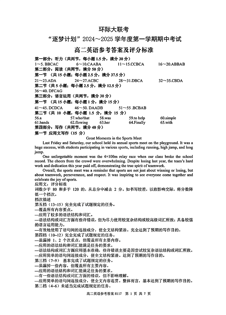 河南省驻马店市环际大联考2024-2025学年高二上学期期中考试 英语答案