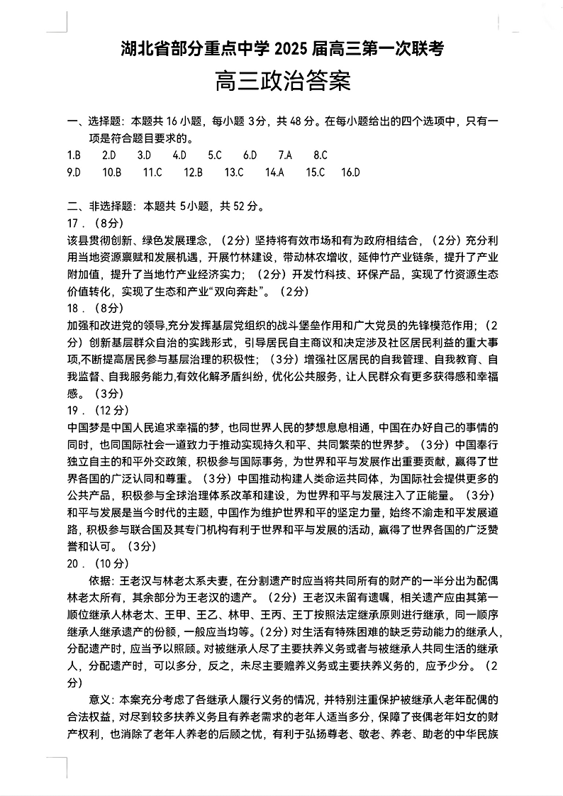 湖北省部分重点中学2025届高三第一次联考 政治答案