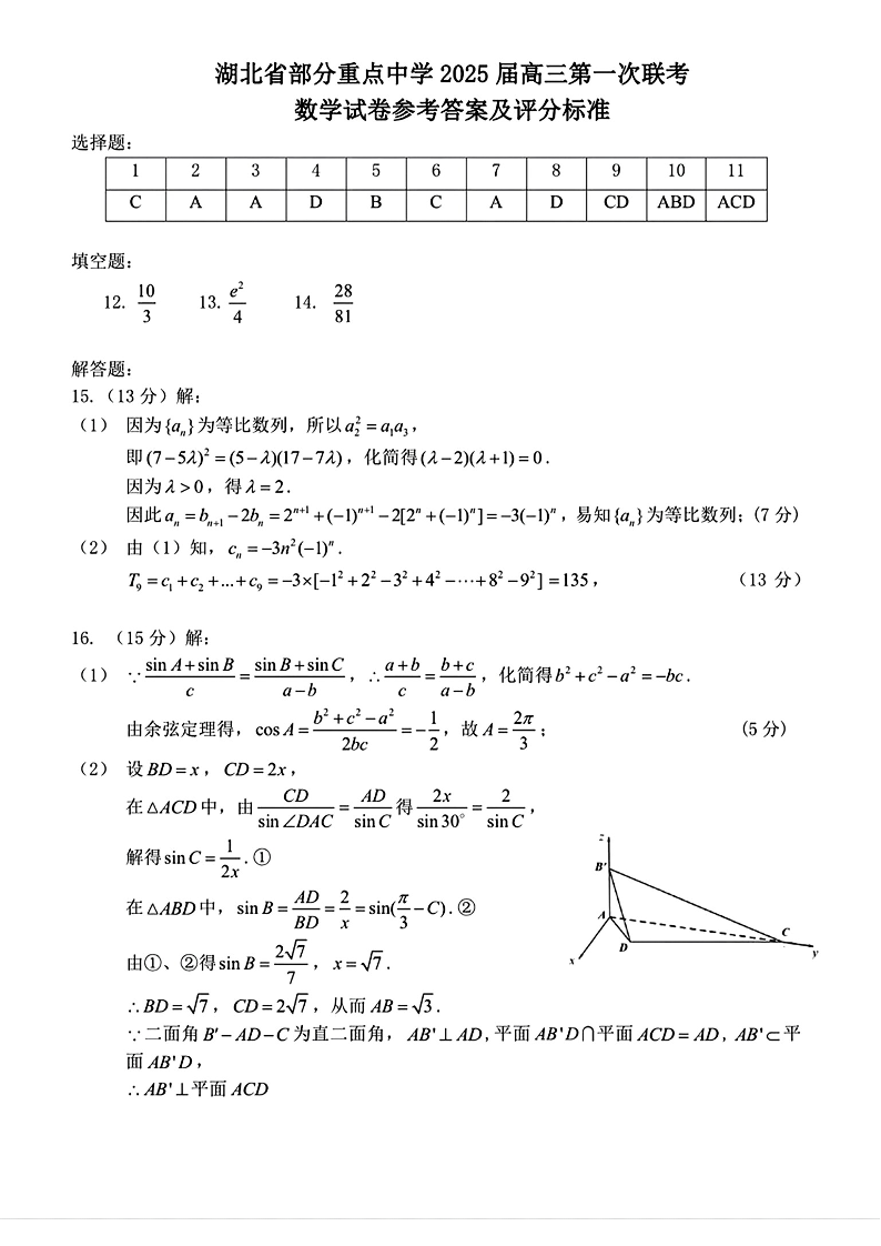 湖北省部分重点中学2025届高三第一次联考 数学答案