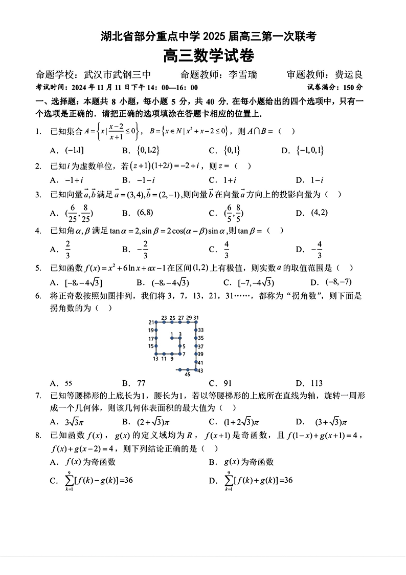 湖北省部分重点中学2025届高三第一次联考 数学