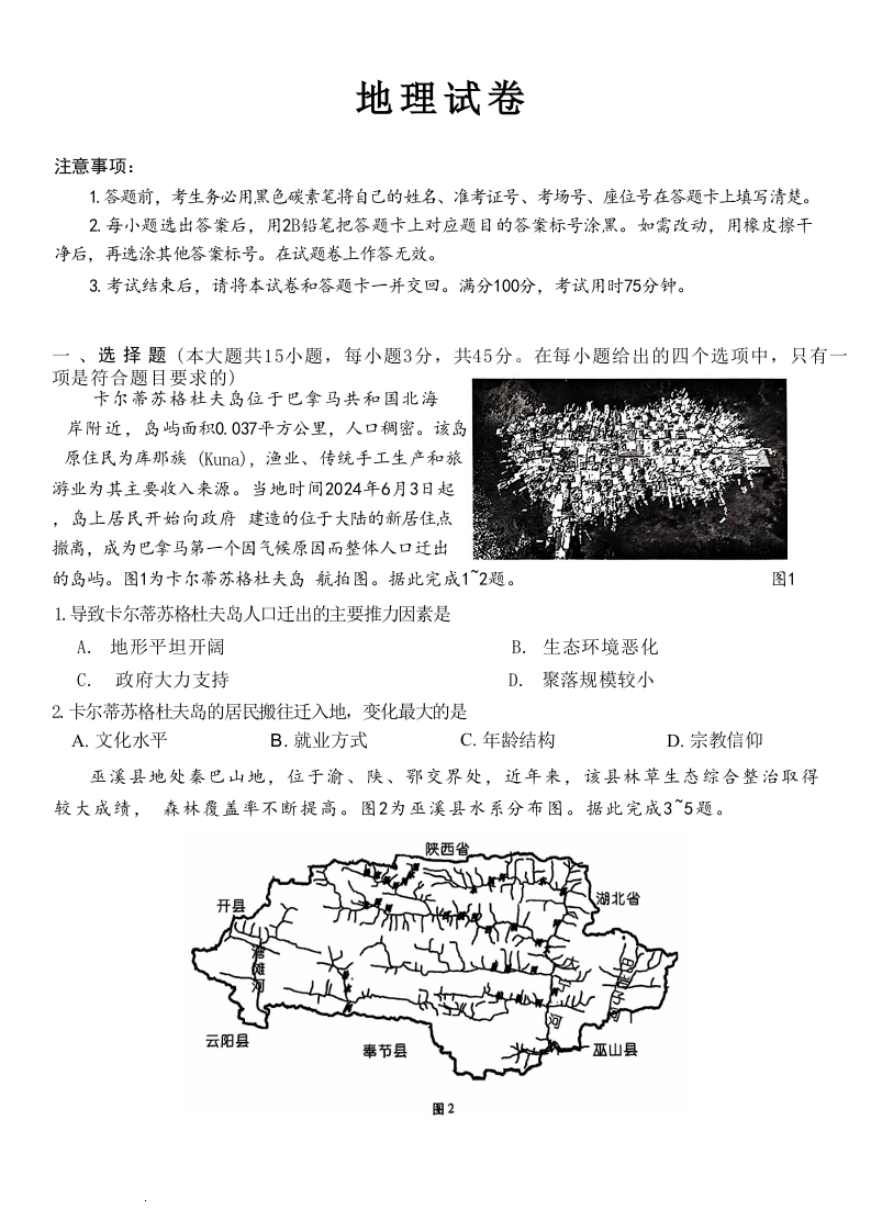 巴蜀中学2025届高考适应性月考卷(三)地理