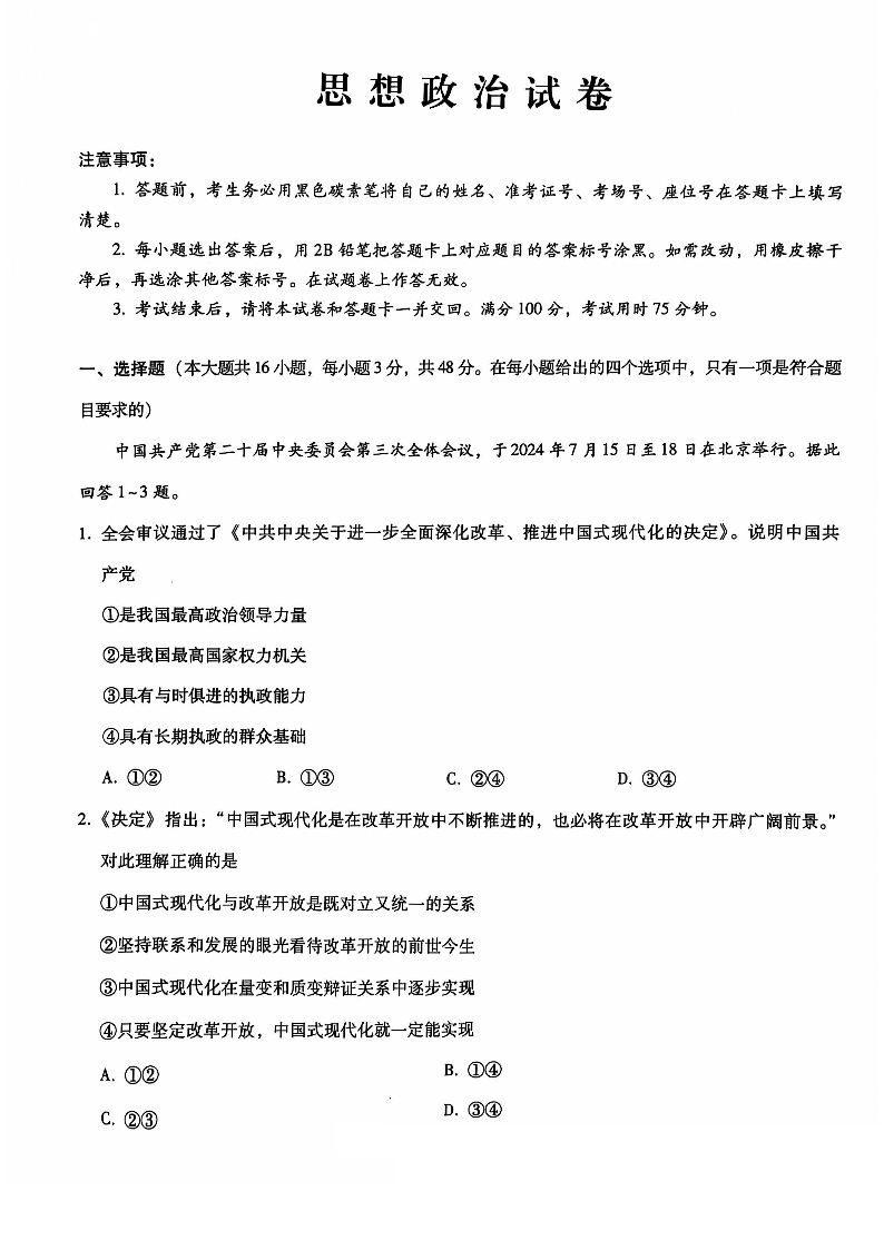 巴蜀中学2025届高考适应性月考卷(三)政治