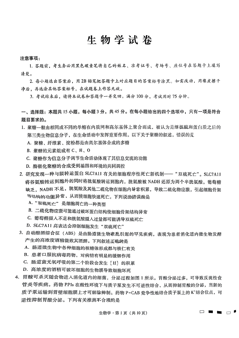 巴蜀中学2025届高考适应性月考卷(三)生物