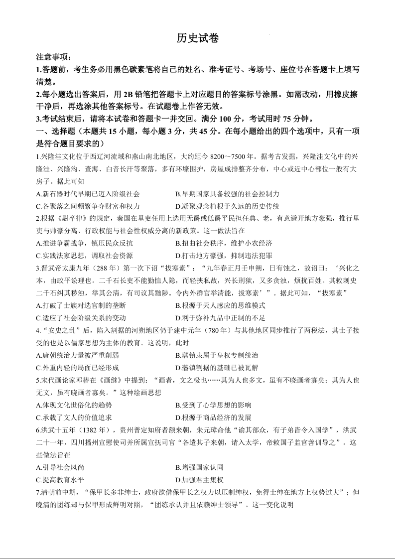 巴蜀中学2025届高考适应性月考卷(三)历史