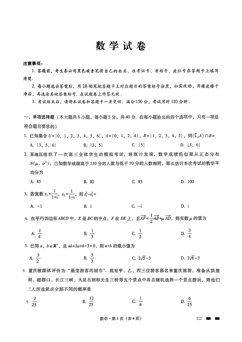 巴蜀中学2025届高考适应性月考卷(三)数学