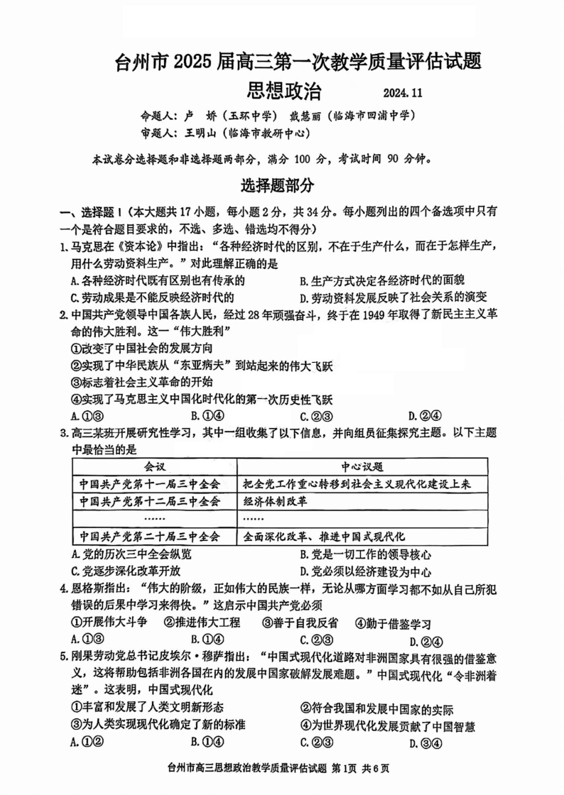 台州市2025届高三第一次教学质量评估 政治