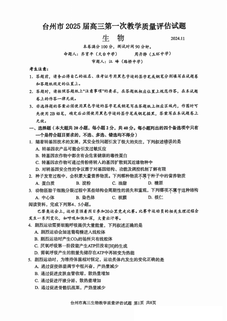 台州市2025届高三第一次教学质量评估 生物