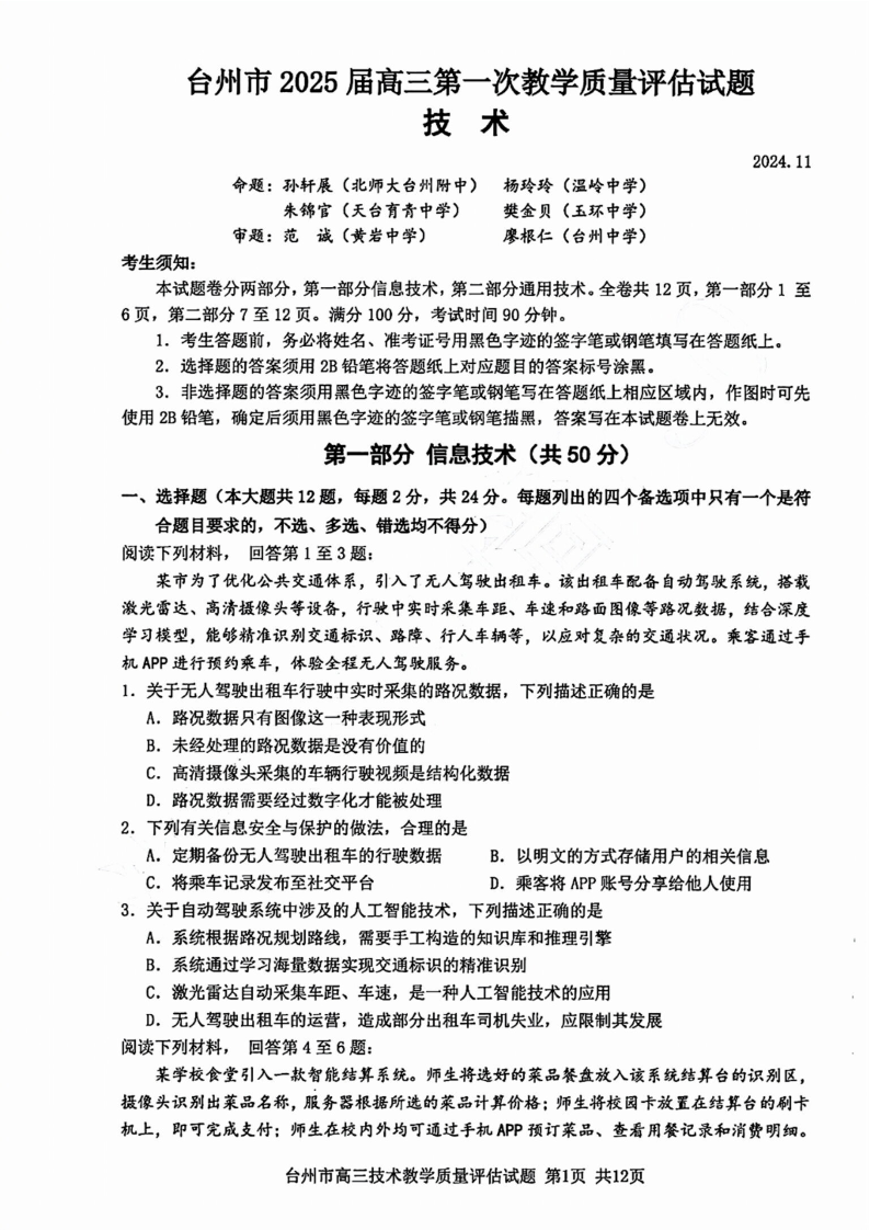 台州市2025届高三第一次教学质量评估 技术