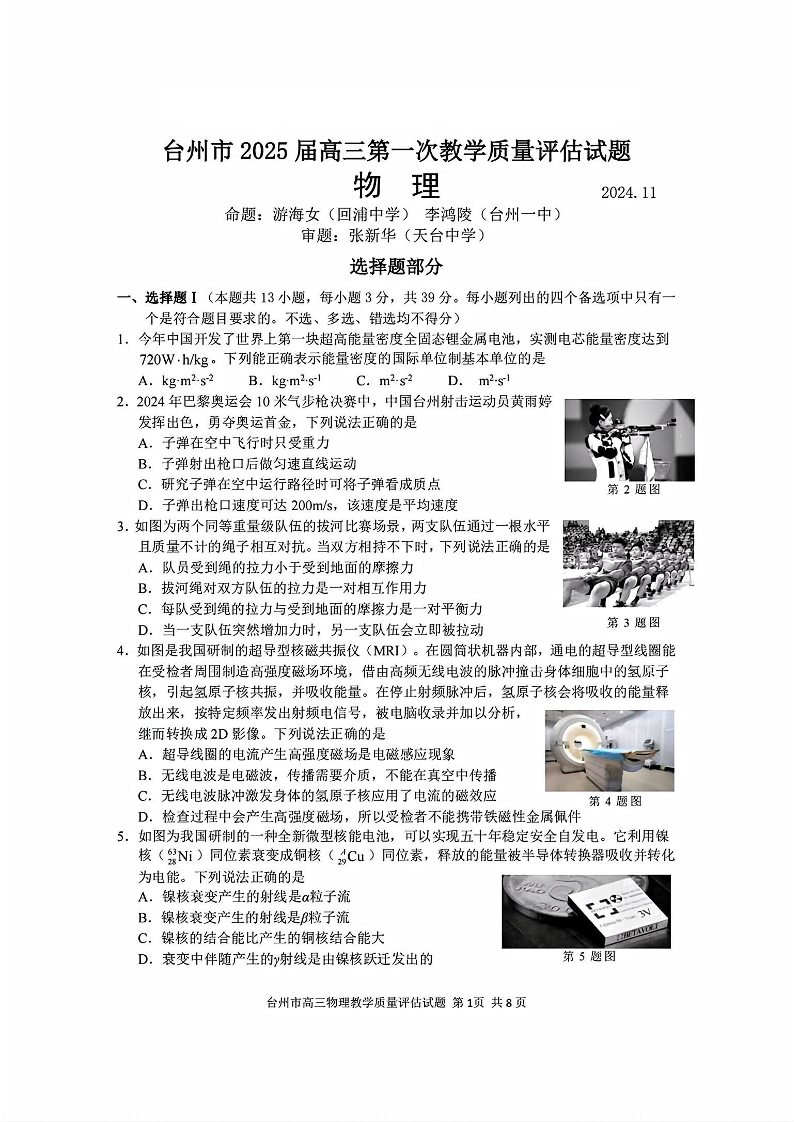 台州市2025届高三第一次教学质量评估 物理